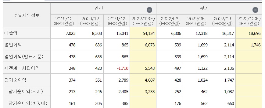 하지만 22년 기준으로 연결 매출 5조 4,124억에 영업이익 6.073억을 기록하며, 전년대비 매출 3.6배, 영업이익 7배가 성장하는 놀라운 성과를 올렸습니다.