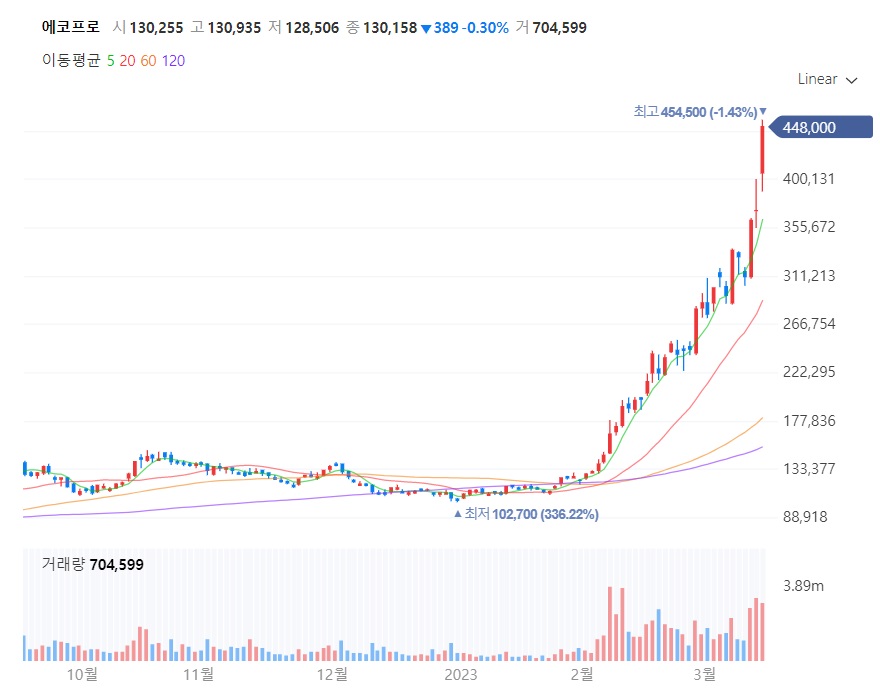 2개월 반 사이에 4배로 급상승한 덕에 뉴스에는 에코프로를 10만원대에 4억원을 투자해서 단기간에 10억을 만든 인생 역전한 스토리도 나돌고 있습니다.