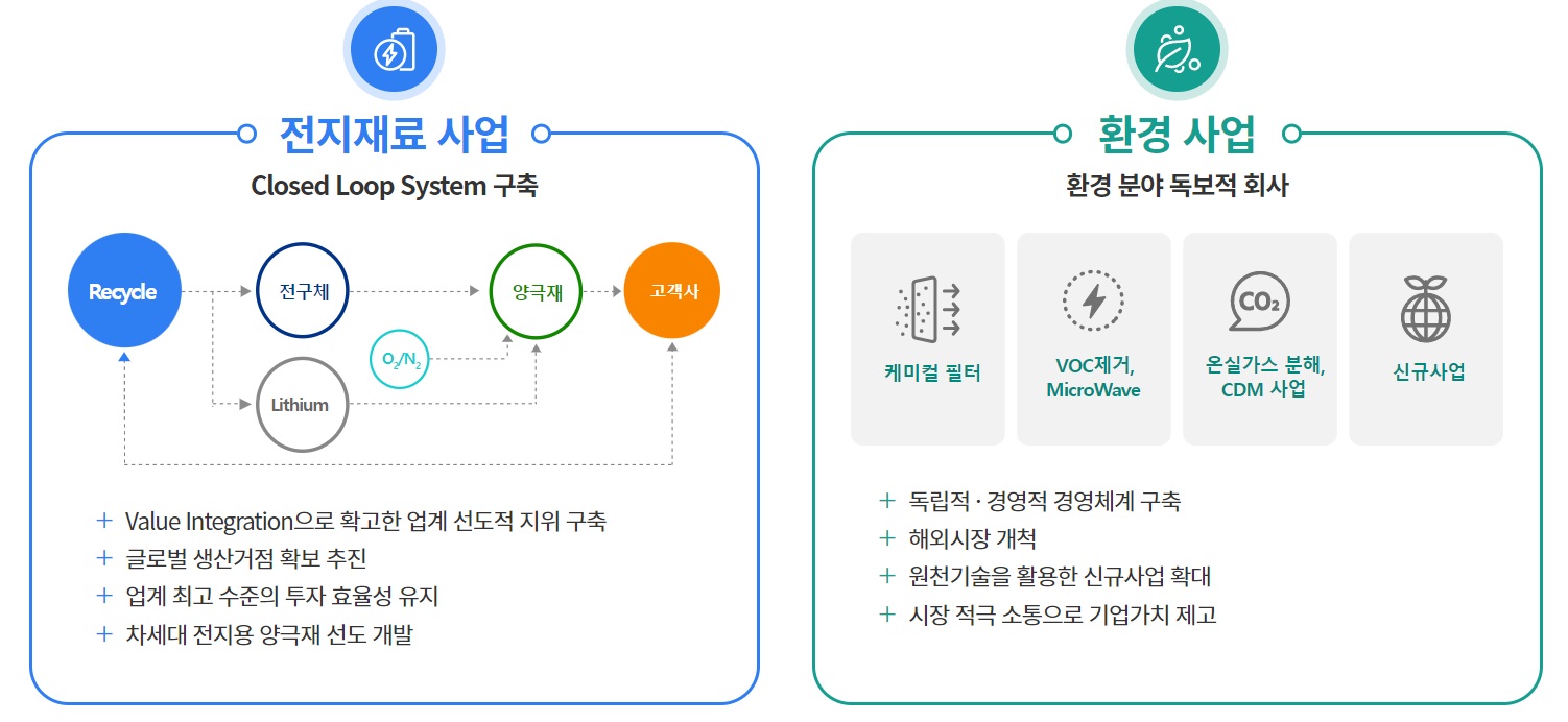 에코프로는 전지재료 사업 영역과 환경사업 영역 두가지의 사업을 추진 중입니다.