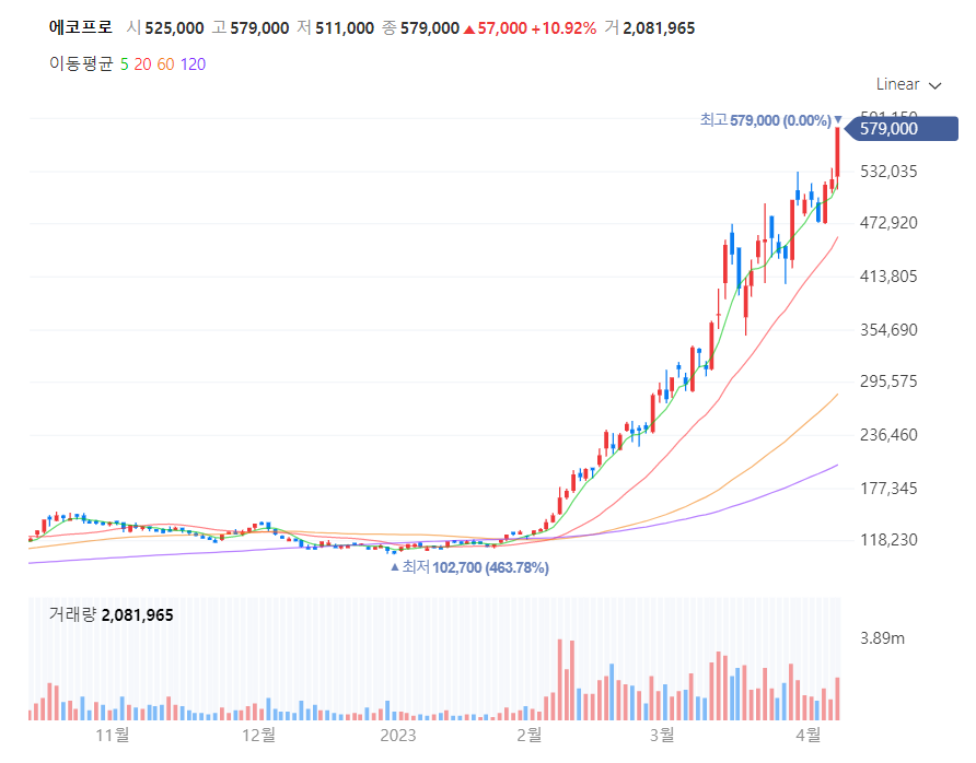 에코프로 주가가 65만원 선을 넘어서며 역대 최고가를 갈아치웠습니다. 에코프로 그룹주이자 2차전지 제조업체인에코프로비엠도 이날 동반 신고가를 경신했습니다.