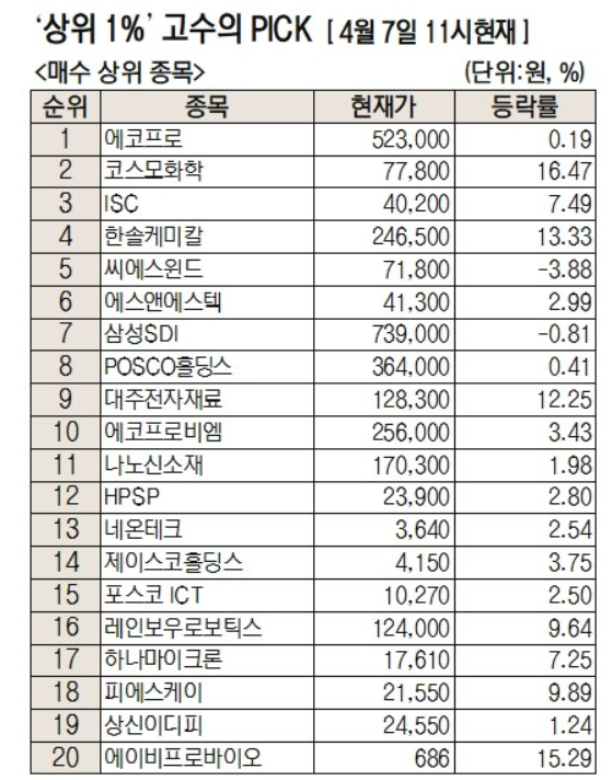 4월 7일 기준 상위 1%의 종목 매수 1위가 에코프로다.