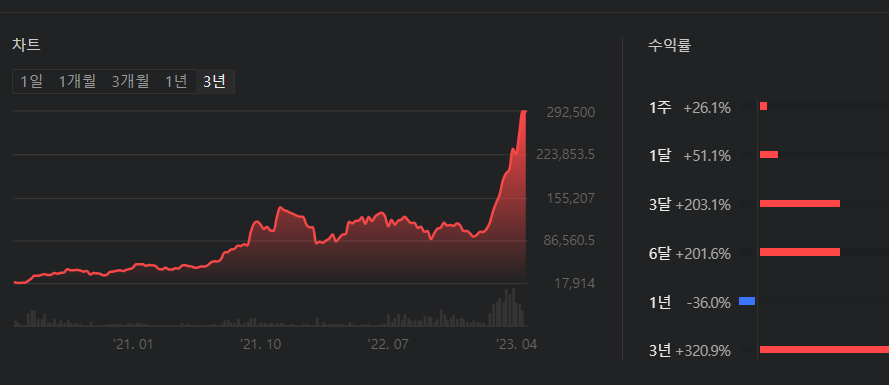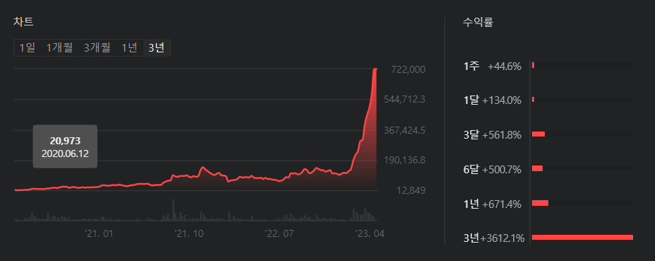 지난 3년의 수익율은 3,612%에 달합니다. 엄청난 상승입니다.