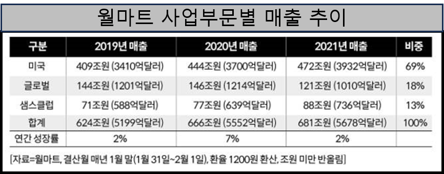 특히 월마트 매출의 69%를 점유하는 미국에서의 매출 성장이 매우 경이롭다. 2021년 매출은 472조원으로 2019년 409조원대비 2년동안 15% 성장했다. 2021년은 코로나가 한창으로 오프라인 매장들의 성과가 좋지 않았다.