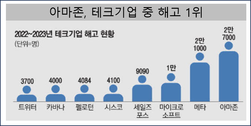 아마존은 실적 저조에 따라 2022년부터 지속적으로 인력을 구조조정하고 있다. 테크 기업 중 가장 많은 인력을 해고한 기업이 아마존인 것으로 나타났다.