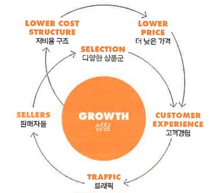 아마존은 더 낮은 가격과 더 좋은 고객경험을 통해 많은 고객을 불러모으고 이렇게 모은 고객들은 더 많은 판매자들을 불러모으는 원동력이 된다. 더 많은 판매자들은 더 많은 상품을 제공하고 온라인몰에서 더 많은 상품 구색은 핵심 경쟁력이 된다.