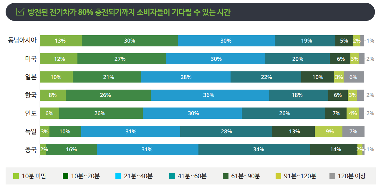 가장 많은 소비자 그룹이 21~40분까지는 기다릴 수 있다고 응답했다. 중국이나 독일에서는 41분~60분까지 대기 가능하다는 응답도 높게 나왔다. 하지만 20분 이내로 충전이 완료되길 기대하는 답변도 적지 않아서 배터리 충전 편의성과 대기 시간등은 실제 전기차의 판매 활성화에 큰 영향을 줄 것으로 보인다.