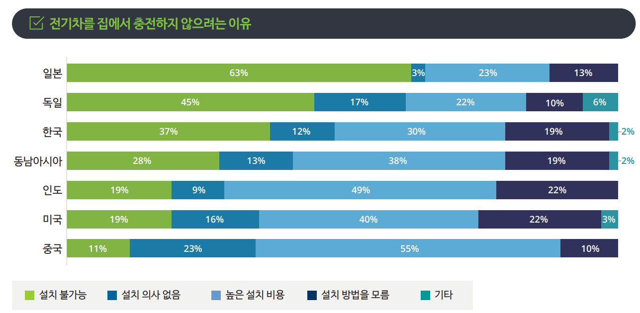 일본과 독일 등은 집에 배터리 충전소를 설치하는 것이 불가능하다고 답변하는 비율이 매우 컸고,