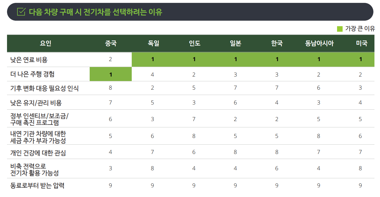 더 나은 주행 경험에 대해서는 대부분의 국가에서 2~3위에 올랐지만, 여전히 자동차 연료비의 감소나 차량 구매시의 보조금 지원 등이 전기차의 수요를 촉진하고 있다고 볼 수 있다.