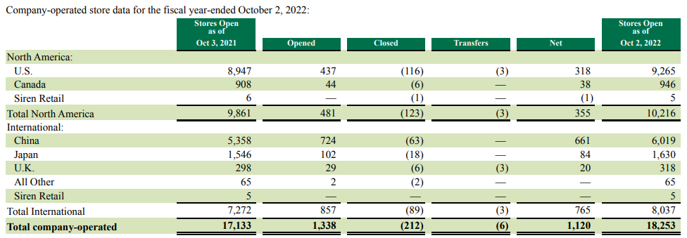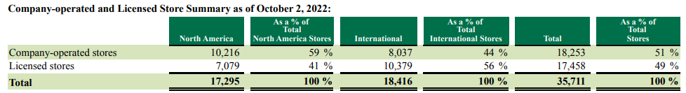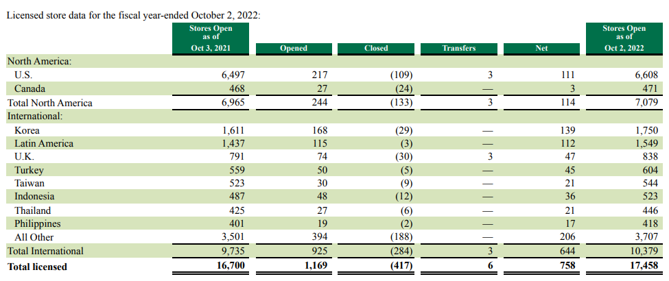 라이센스 매장도 미국에 가장 많은 6,608개 점포를 운영하고 있다. 그 다음 가장 많은 점포는 한국으로 1,750개의 매장을 운영 중이다. 21년 1,611개였으나 22년 168개 매장을 추가 오픈했고, 29개 매장을 닫으면서 139개의 매장 순증이 있었다.