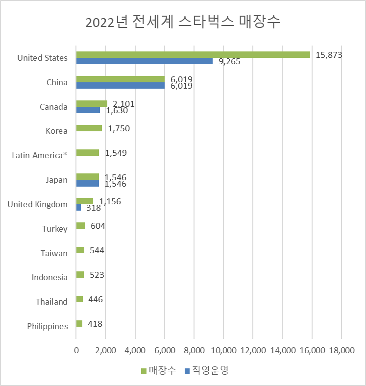 스타벅스 본사가 직접 운영하는 글로벌 매장 수는 22년 9월말 기준으로 총 18,253곳이다.