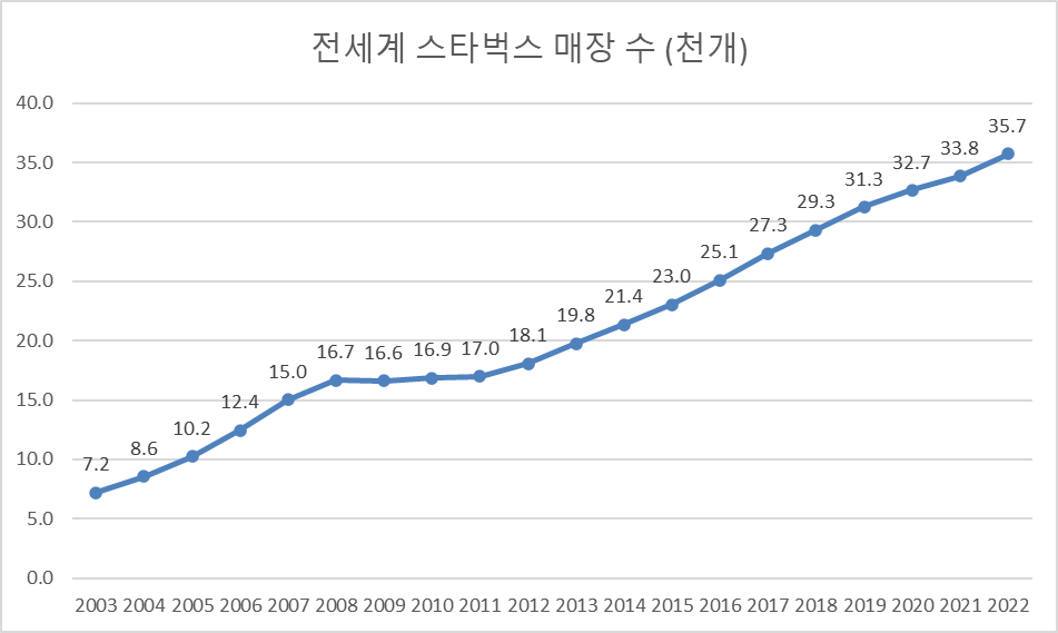 2022년 기준, 전세계 스타벅스 매장은 35.7천개다. 매년 꾸준히 매장이 증가하는 것이 보이죠?
