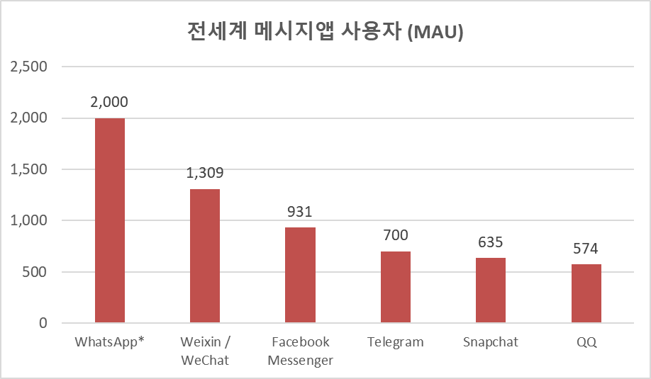 - 각 업체의 발표에 따르면 전세계에서 가장 많이 사용되는 메시지앱은 왓츠앱이다.