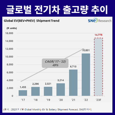 SNE Research 보고서에 따르면 22년 전세계 각국에 차량 등록된 전기차 대수는 총 1083만대다. 이는 21년대비 61.3% 상승한 수치다. SNE의 트래커가 예측한 바에 따르면, 2023년에는 전기차 등록이 1,477만 5천대까지 증가할 것으로 예상되며, 이는 22년대비 36% 증가한 수치다.