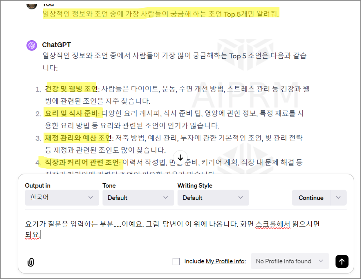 저는 위에 gpt가 답변한 내용을 가지고 사람들이 가장 많이 묻는 질문중에 '일상적인 정보와 조언' 중에 Top 5가 뭔지 알려달라고 했습니다. 아래 답변 보이시죠?? 역시 사람들이 건강과 웰빙, 요리와 먹는 것에 관심이 많네요.