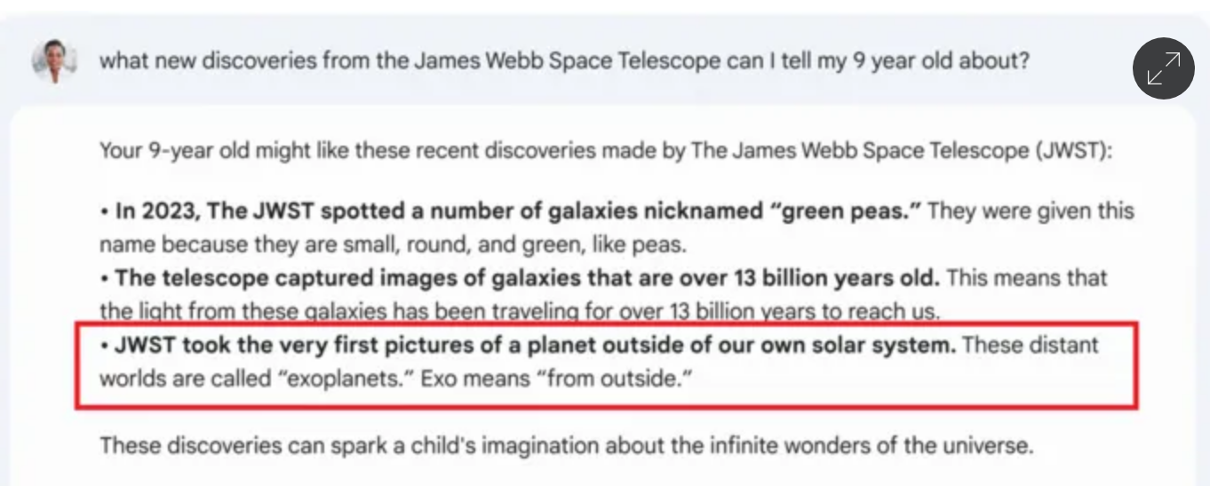 구글의 시연 영상에서 바드는 “태양계 밖 행성에 대한 최초의 사진을 제임스 웹 우주망원경이 찍었다”고 대답했는데 이게 사실이 아니라고 합니다. 그 이전에 인류는 약 20여개의 외계행성 이미지를 촬영하는 데 성공했다고 합니다.