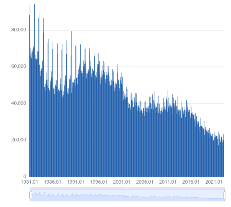 1981년 1월 88,151명이 태어났는데, 2023년 2월에는 19,939명이 태어났습니다.