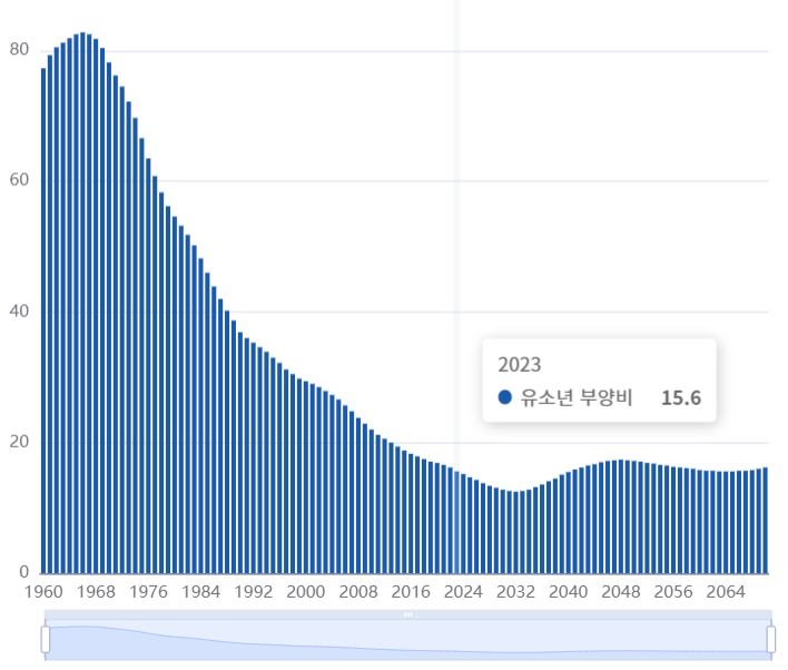 현재의 결혼과 출산 추세로는 유소년 부양비의 숫자는 좀 더 낮아질 가능성이 크다고 봅니다.