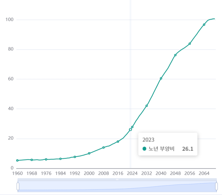 즉, 2050년이되면 생산 연령인구인 15~64세 인구 100명당