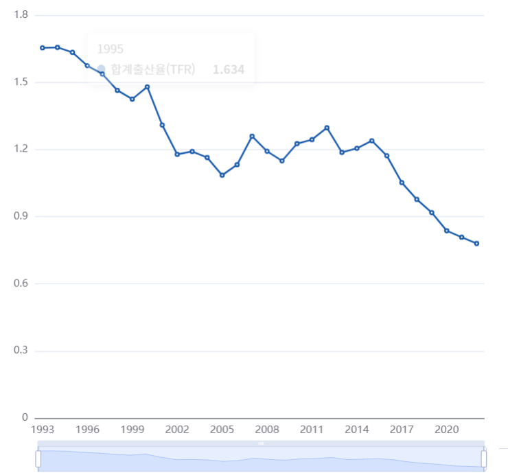 22년 기준 가임여성 1명당 합계 출산율은 0.78명입니다. 매우 저조한 수치입니다.