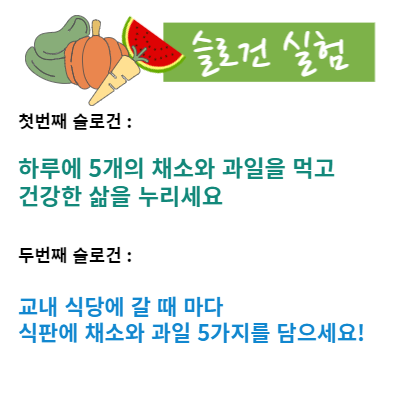 두번째 슬로건 : 교내 식당에 갈 때 마다 식판에 채소와 과일 5가지를 담으세요!