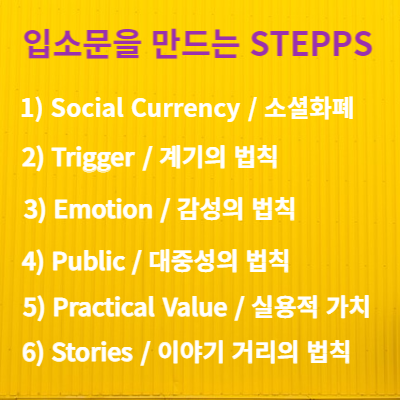 전염성의 6가지 법칙은 영어의 첫글자를 따서 간단하게 STEPPS라고 부른다.