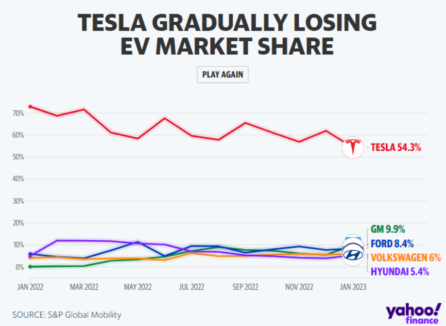 하지만 현대자동차와 기아 자동차를 포함한 많은 자동차 회사들이 전기차 시장에 적극적으로 뛰어들고 있기 때문에 테슬라의 전기자동차 시장 점유율은 22년 1월 70% 이상에 대비해서는 많이 하락한 수치입니다.