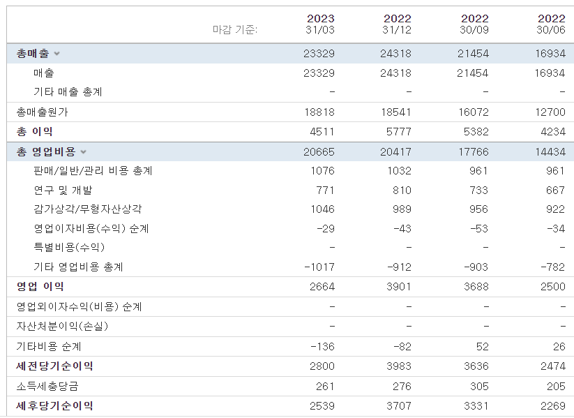 세부 손익 계산서로 보면, 전분기 대비 매출은 -4% 하락했지만, 매출 원가는 오히려 1.5% 증가했습니다.