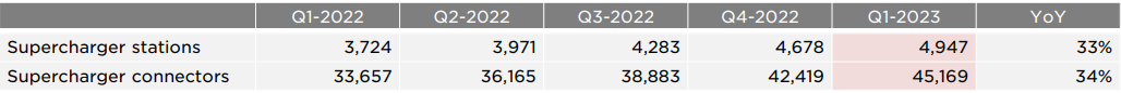 테슬라의 급속 충전소인 '슈퍼차저'는 북미 시장인 미국과 캐나다에 23년 1분기 기준 4,947개 Station을 가지고 있고, 슈퍼차저 컨넥션은 45,169개에 달한다. 이는 전체 급속 충전기 수량의 60%의 비중이다.
