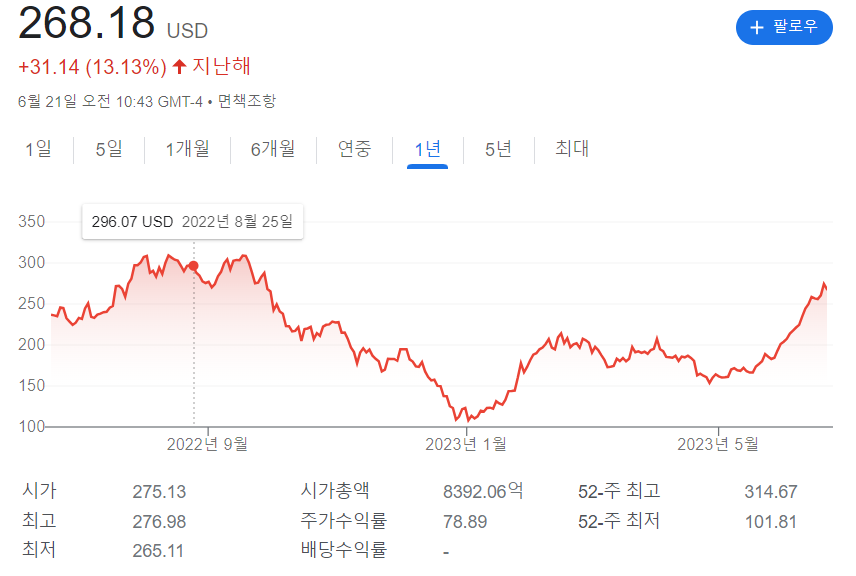 테슬라는 지난 23년 1월 52주 최저점인 101.81달러 기록 후, 23년 6월 20일 현재 268.18달러로 저점 대비 2.63배의 주가를 기록 중이다.