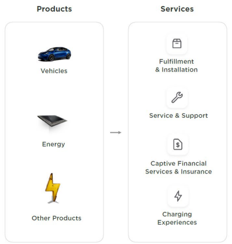 테슬라는 전기차 외에 배터리(에너지) 제품을 가지고 있고, 서비스로서 물류, 서비스지원, 금융 서비스, 충전소 서비스를 가지고 있다.