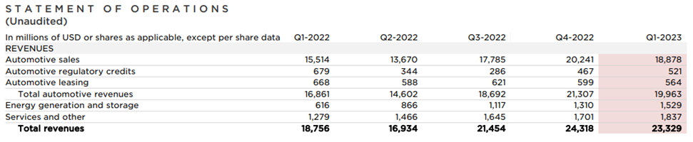 23년 1분기 전체 매출 233억 29백만달러 중에서 자동차 판매 수익은 188억 78백만달러로 전체 매출의 81%에 달한다. 급속 충전소를 포함한 서비스 상품 매출은 18억 37백만달러로 7.8%의 매출 비중을 차지한다.