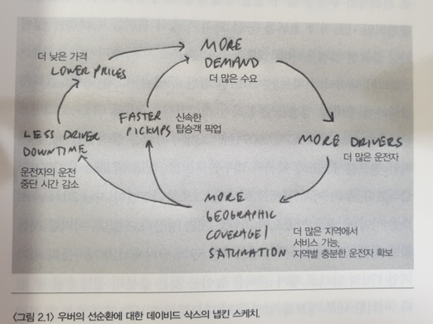 아마존의 사례는 워낙 유명하니 아래는 우버의 선순환에 대해 데이비드 삭스가 그린 냅킨 스케치다.