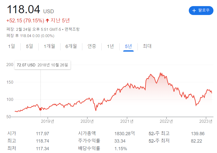 23년 2월 24일 현재 118달러 수준으로 직전 저점 97달러 대비 상승한 상황이다.