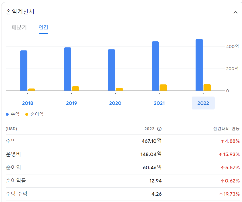 나이키의 5년간 매출,이익 그래프(2018.2월 - 2023.2월), 출처: 구글