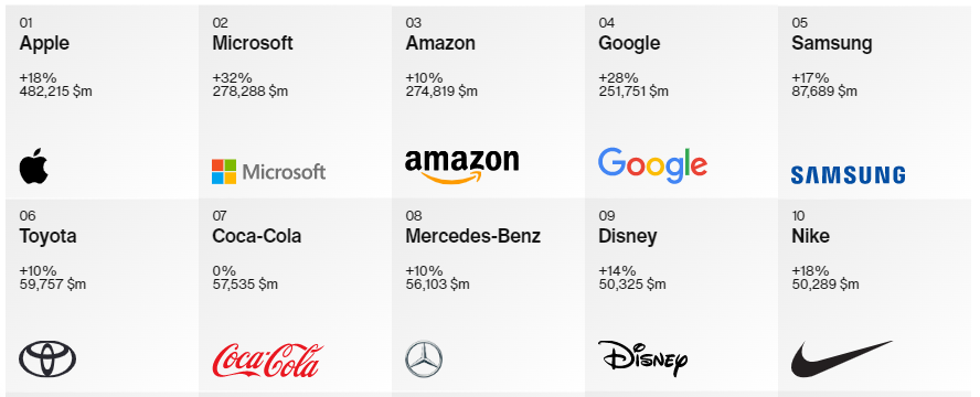 (자랑스럽게도 우리의 삼성도 877억 달러 (원화로 115조 5,886억 원) 로 글로벌 브랜드 5위를 달성하는 쾌거를 이루었다)