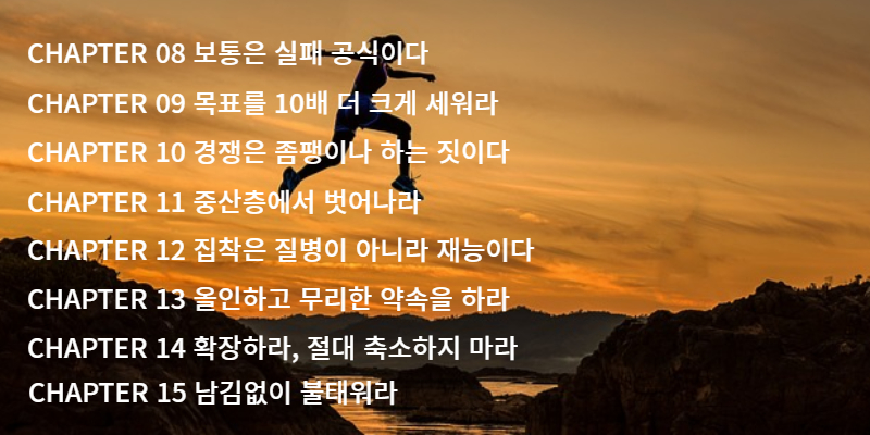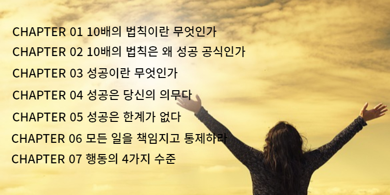 10배의 법칙은 목차 자체가 10배의 법칙을 잘 보여준다. 23개의 목차 하나 하나가 행동 강령이다.