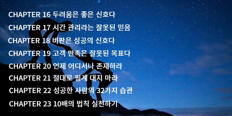 10배의 법칙은 목차 자체가 10배의 법칙을 잘 보여준다. 23개의 목차 하나 하나가 행동 강령이다.