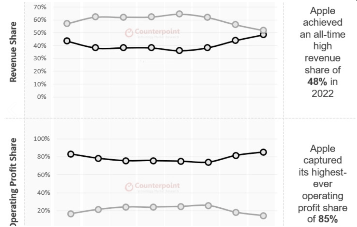 애플의 22년 시장 점유율은 18.3%지만, 매출 기준 점유율은 48%이고, 영업 이익 기준 점유율은 85%다.