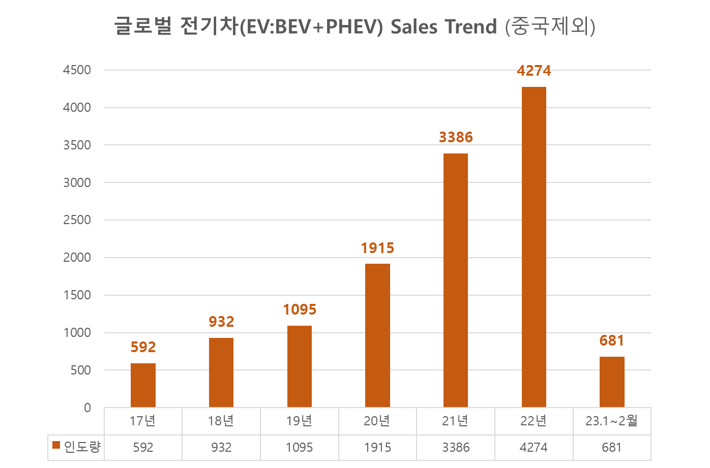 23년 1~2월 중국을 제외한 글로벌 전기차 판매량은 총 681천대로 전년 동기대비 33.2% 증가했다.