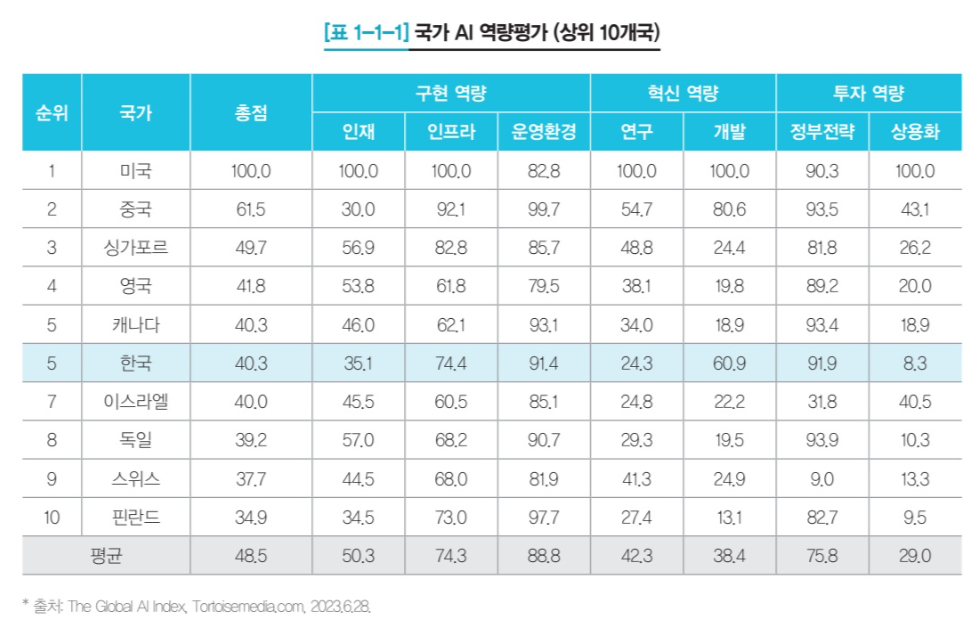 글로벌 조사 기관인 Tortoise가 2023년 6월에 발표한 <Tortoise Global AI Index> 결과에 따르면 전 세계 62개 국가에 대해 평가한 AI 역량 조사 결과, 한국은 미국의 점수 100점 만점 기준으로 40.3점을 맞으며 캐나다와 함께 공동 5위를 기록했다.