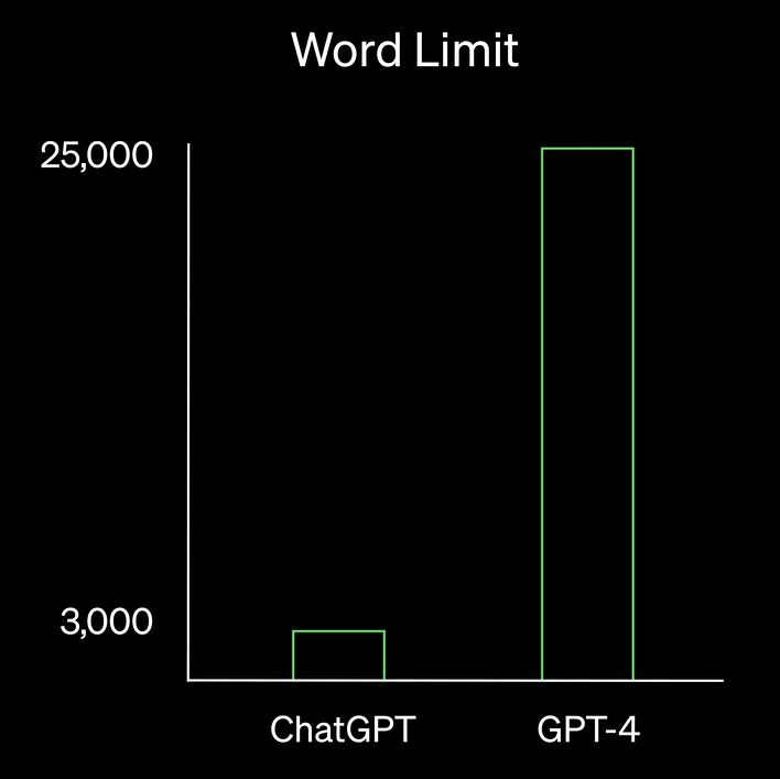 GPT-4는 25,000단어 이상의 텍스트를 처리할 수 있어 긴 형식의 콘텐츠 생성, 확장된 대화, 문서 검색 및 분석과 같은 사용 사례를 허용한다. 기존 챗GPT가 2천자 가량만 가능했던 것에 비해 확장된 텍스트 처리 성능은 글쓰기와 글을 요약하는 등의 업무에 탁월한 성과를 보여줄 수 있을 거란 기대감이 든다.
