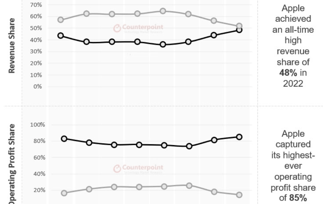 카운터 포인트의 발표에 따르면 2022년 전체 스마트폰 시장의 축소에도 불구하고 애플은 세계 M/S에서 가장 큰 성과를 올렸습니다.