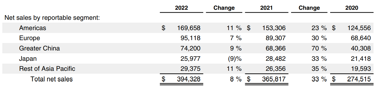 애플은 2022년 미국을 비롯한 아메리카 대륙에서 전년비 11% 성장하며 가장 큰 매출 성장율을 올렸습니다. 전세계 매출의 43%가 아메리카에서 나옵니다. 2022년 전세계적으로 유일하게 일본에서 -9% 역성장 하면서 일본에서의 매출 비중이 6.6%로 하락했습니다.2020년에는 일본 매출 비중이 7.8%였습니다. 중국 매출은 742억 달러(원화 96조 4,600억원)으로 애플 전체 매출 비중의 18.8%에 이릅니다.