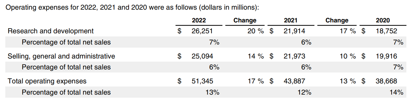 애플 판매관리비도 2022년 오히려 감소하여 전체 판매관리비율이 2020년 14%에서 2022년 13%까지 줄어들었습니다.
