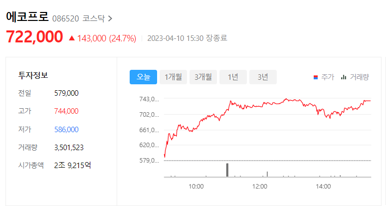 에코프로는 4월 10일 종가 722천원으로 전주 금요일대비 24.7% 상승해서 143천원 올랐습니다.