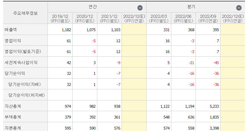 22년 영업 이익은 흑자를 기록했으나, 당기 순이익은 큰 폭의 손실을 기록했다.
