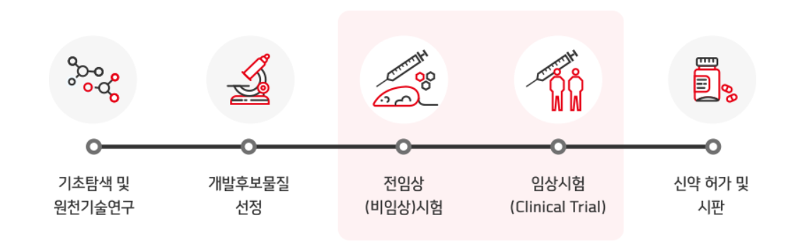 기초탐색 및 원천기술연구 과정 → 개발후보물질 선정 단계 → 전임상(비임상)시험 단계 → 임상시험(Clinical Trial)과정 → 신약 허가 및 시판 순이다.