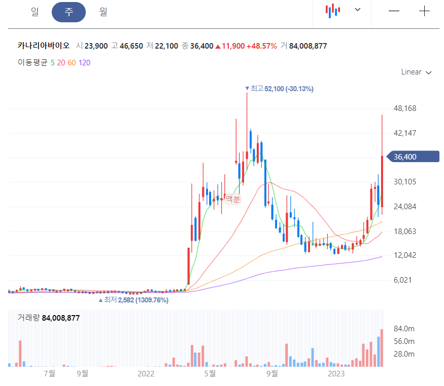 카나리아 바이오의 전고점은 52,100원이다.12,300원까지 떨어졌다가 23년들어 주가가 급상승 중이며, 그 배경에는 임상 3기 진행과 승인이 주가 급등의 배경으로 보인다.