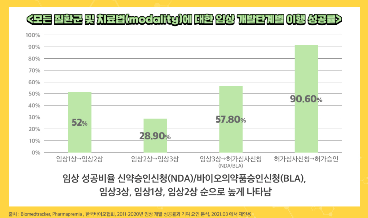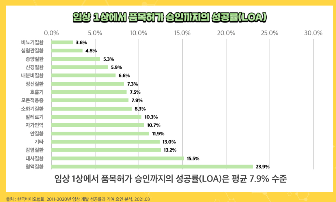 임상 1상에서 품목허가 승인까지의 성공률(LOA)은 평균 7.9% 수준으로 높지 않다.