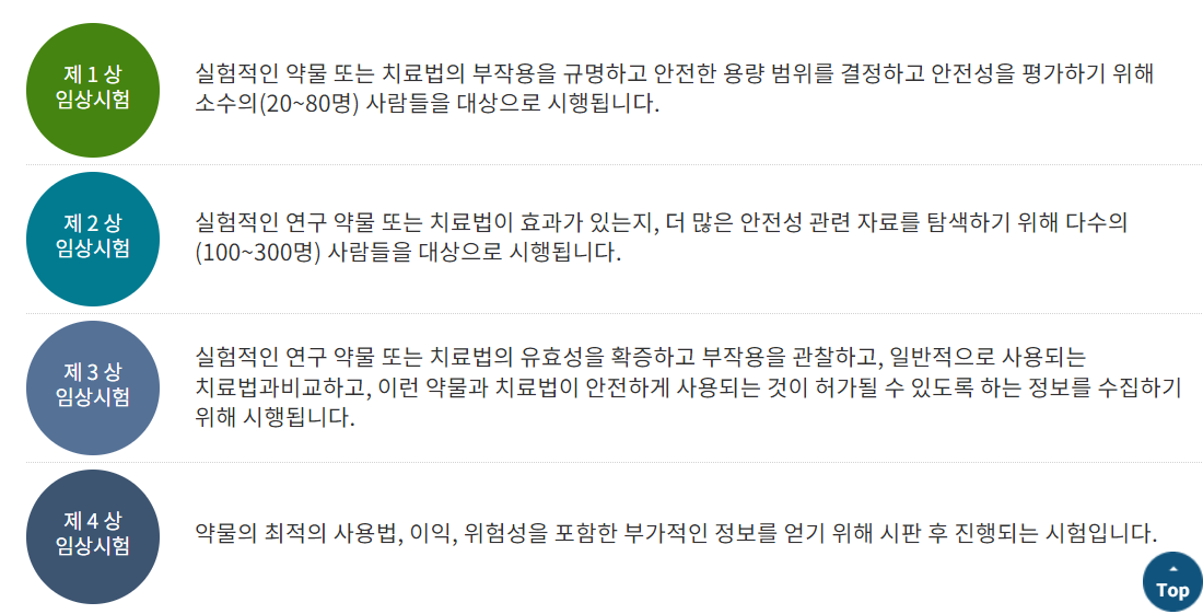 - 건강한 사람을 대상으로 약물의 효능과 독성, 부작용 등을 관찰하는 임상 1상,